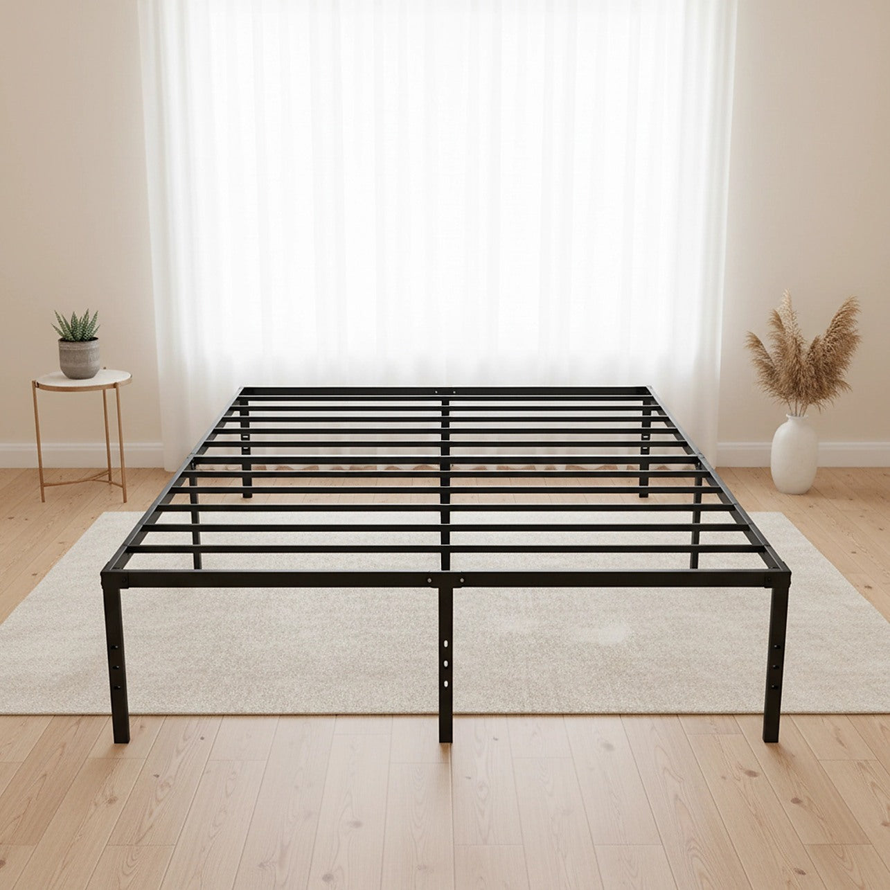 Crafted from high-quality steel, this heavy-duty queen bed base features 9 reinforced legs and a sturdy slatted structure for enhanced support — no box spring required. The black minimalist design fits effortlessly into residential bedrooms, guest rooms, apartments, dorms, or short-stay accommodations.