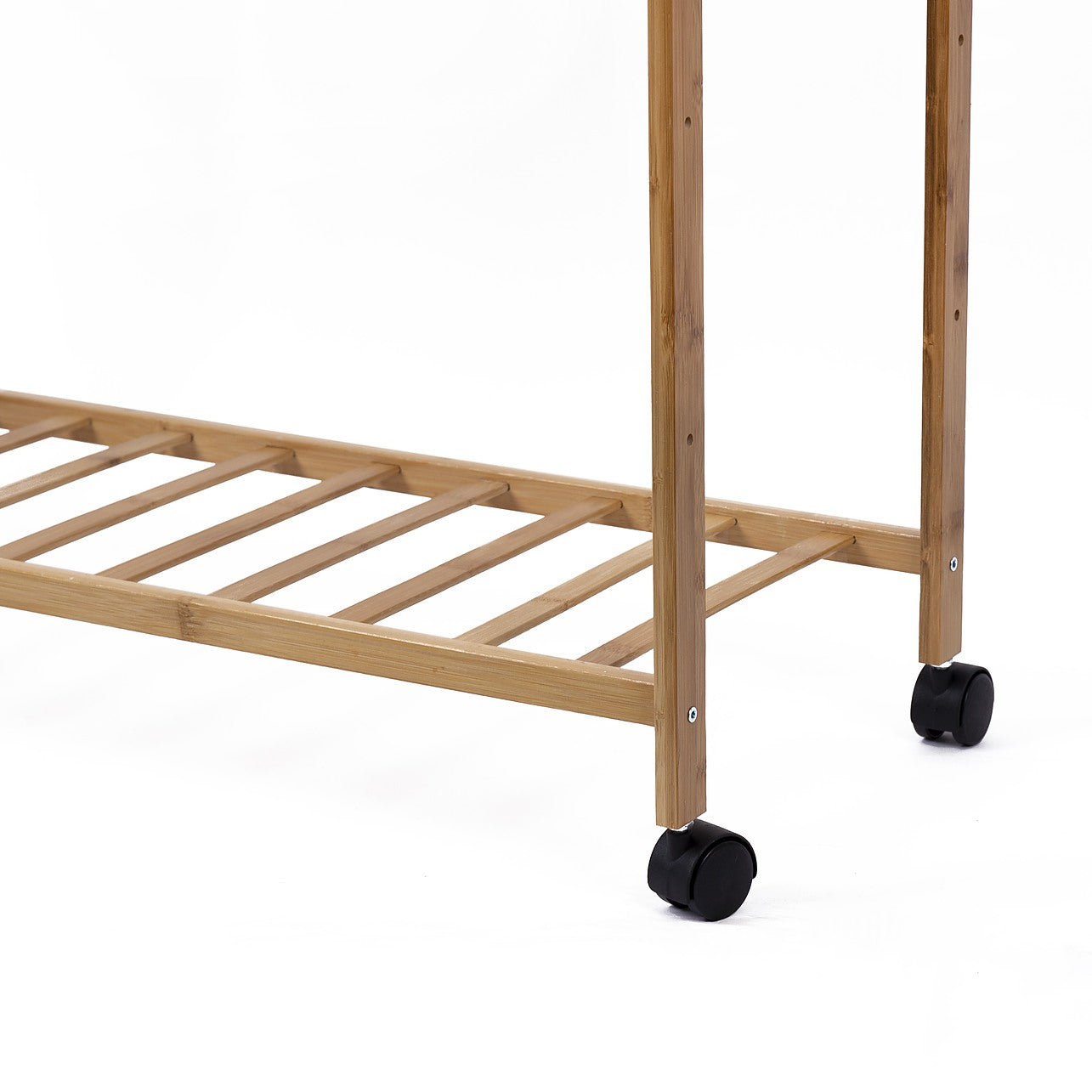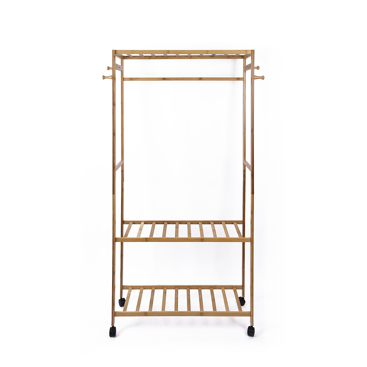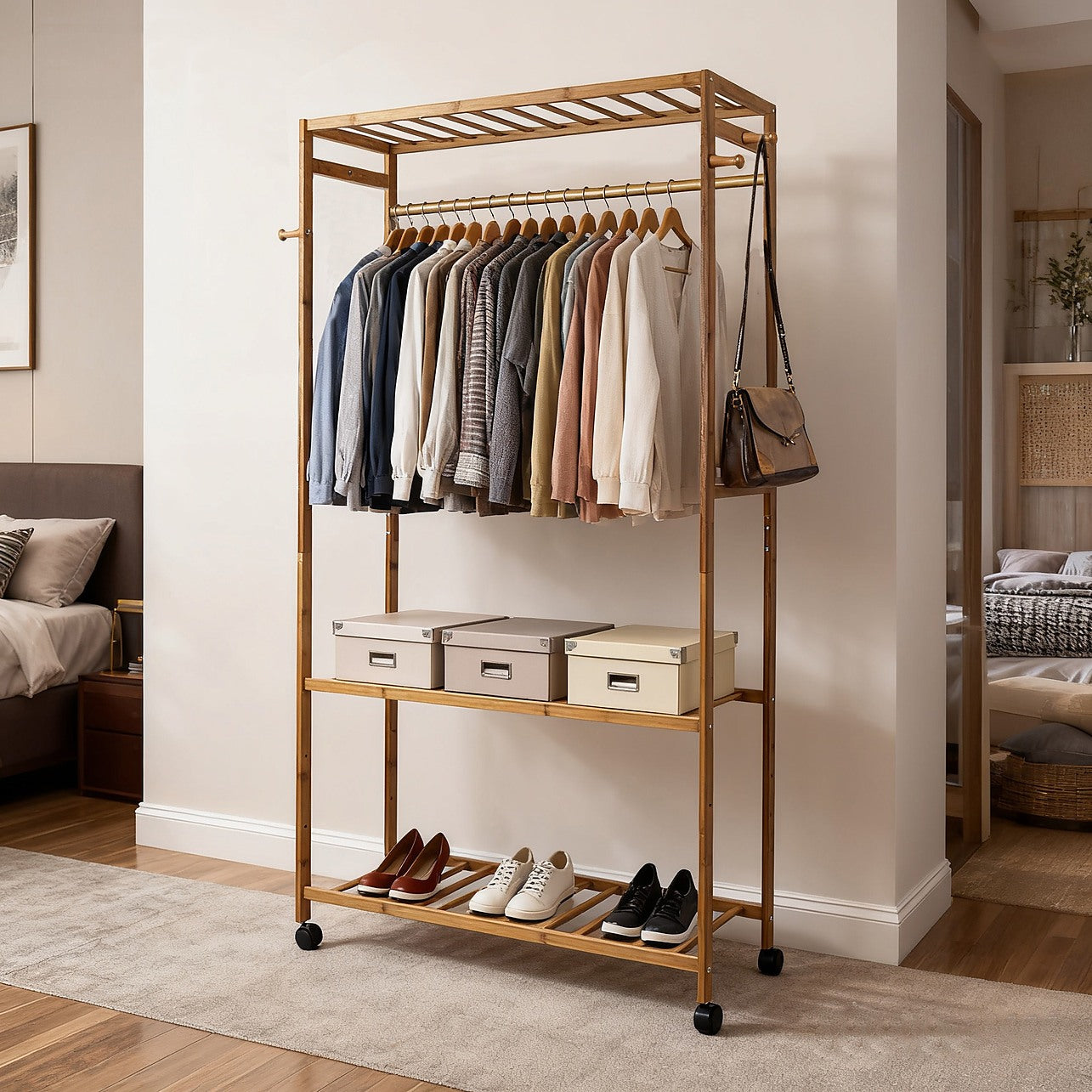 Heavy Duty Wooden Clothes Rail with Shelves & Wheels – Open Wardrobe Rack Stand