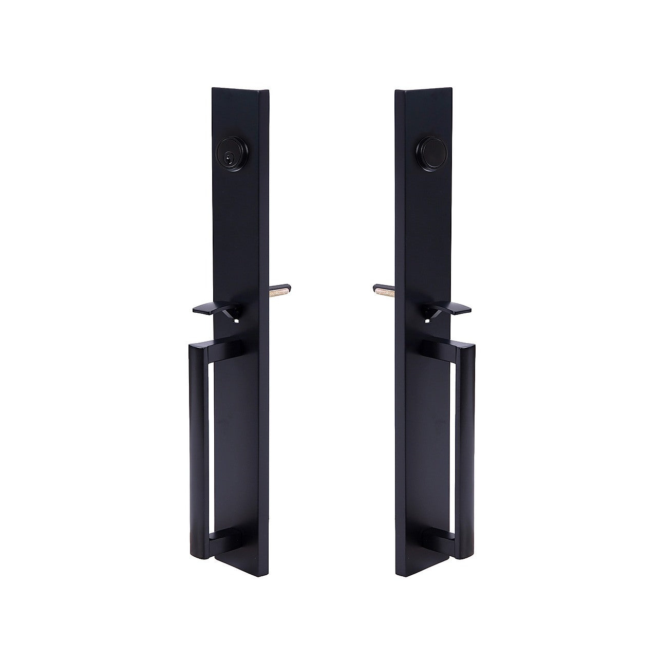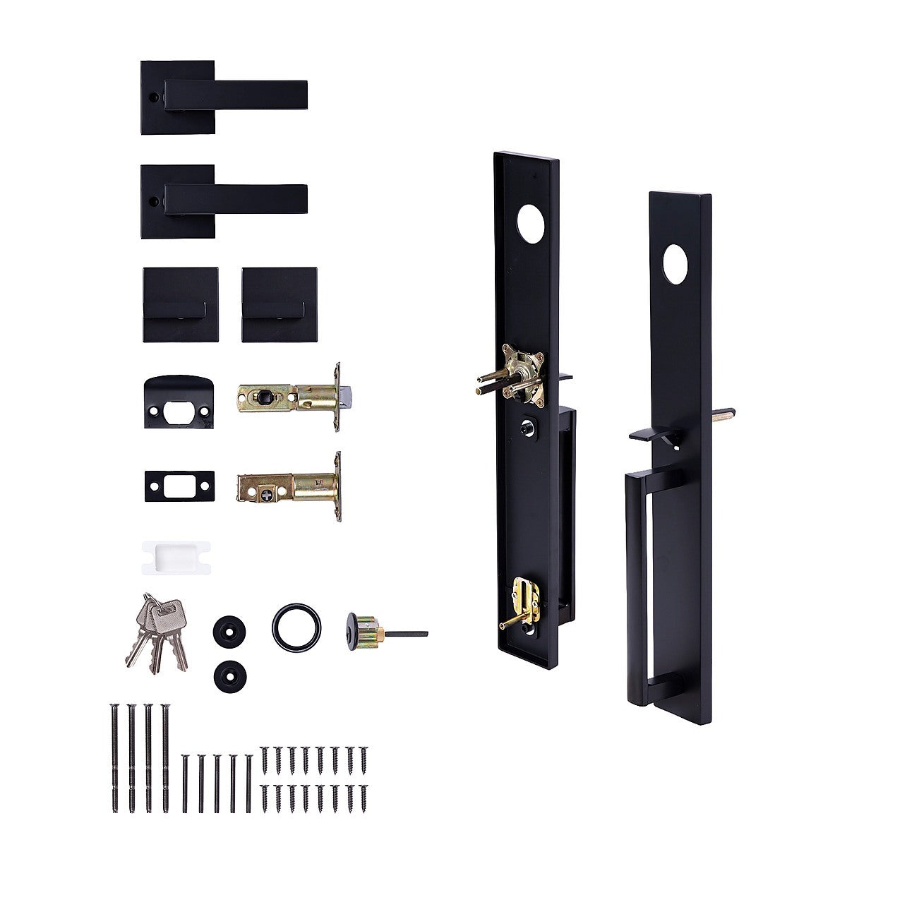 - Single door handle set designed for front entry and office doors