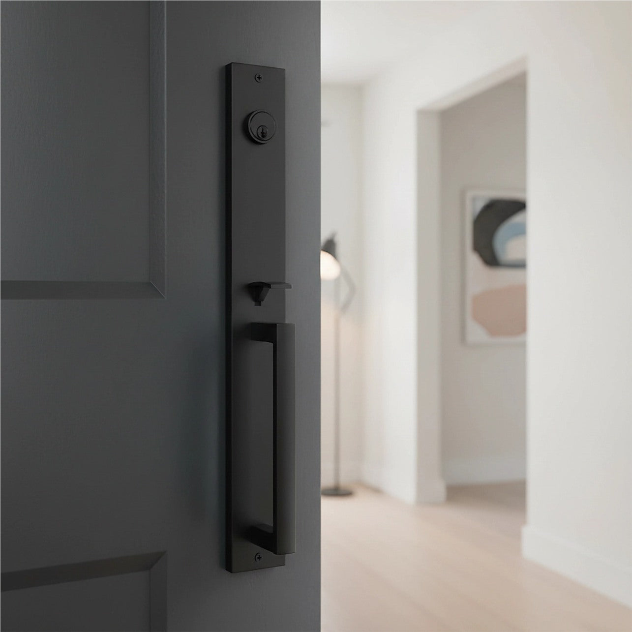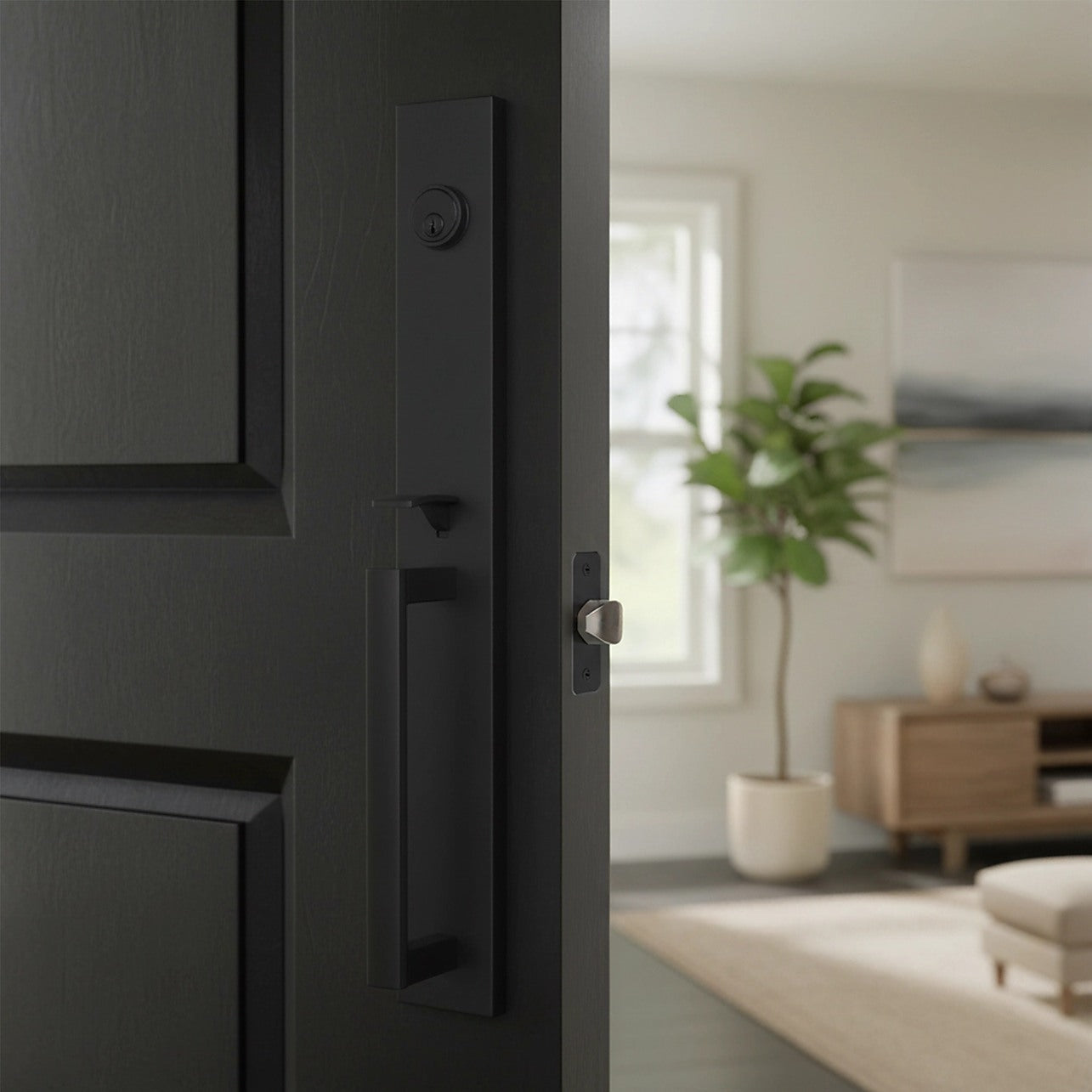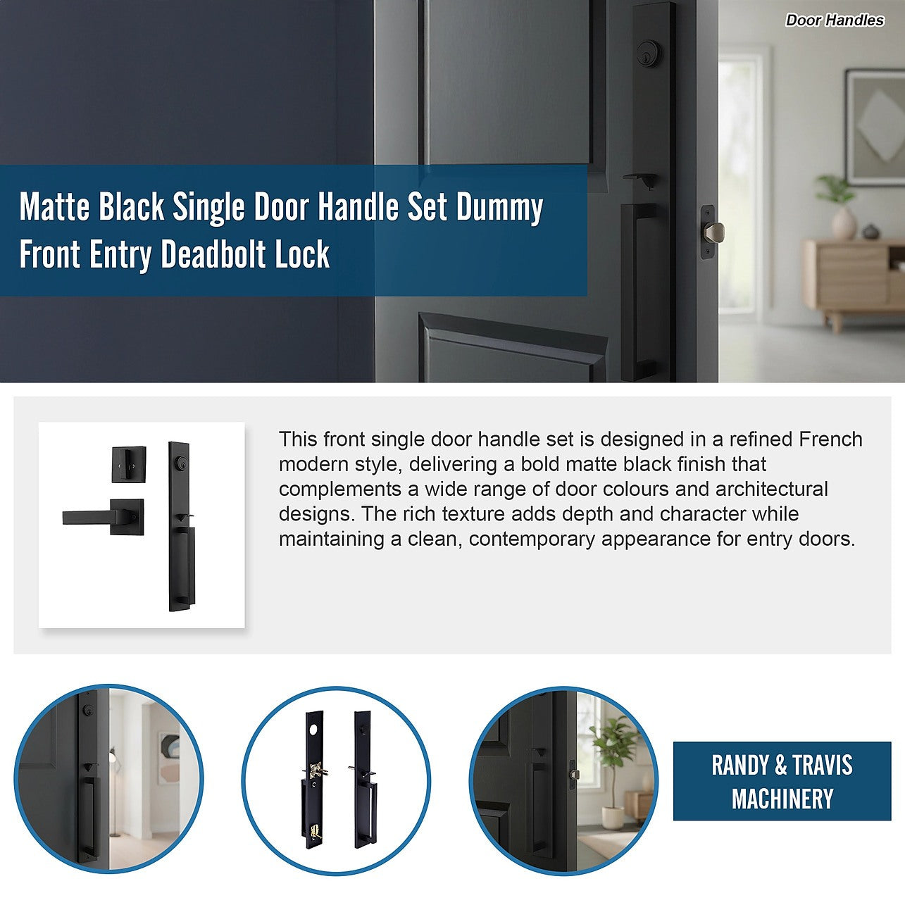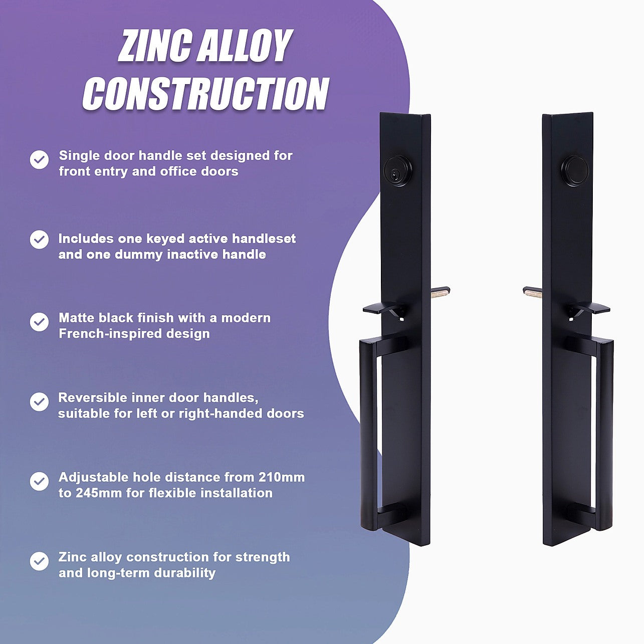 This front single door handle set is designed in a refined French modern style, delivering a bold matte black finish that complements a wide range of door colours and architectural designs. The rich texture adds depth and character while maintaining a clean, contemporary appearance for entry doors.