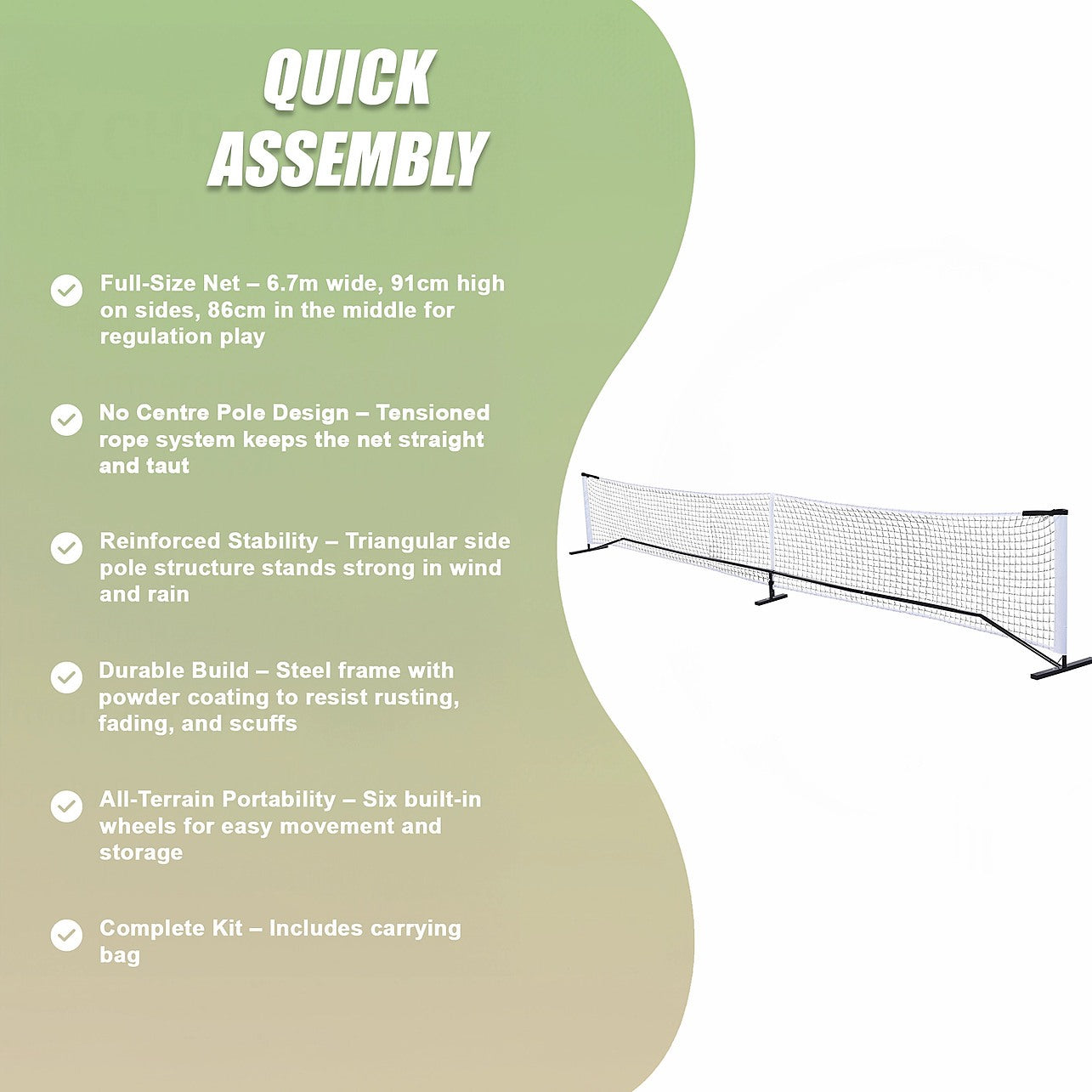 - Full-Size Net – 6.7m wide, 91cm high on sides, 86cm in the middle for regulation play