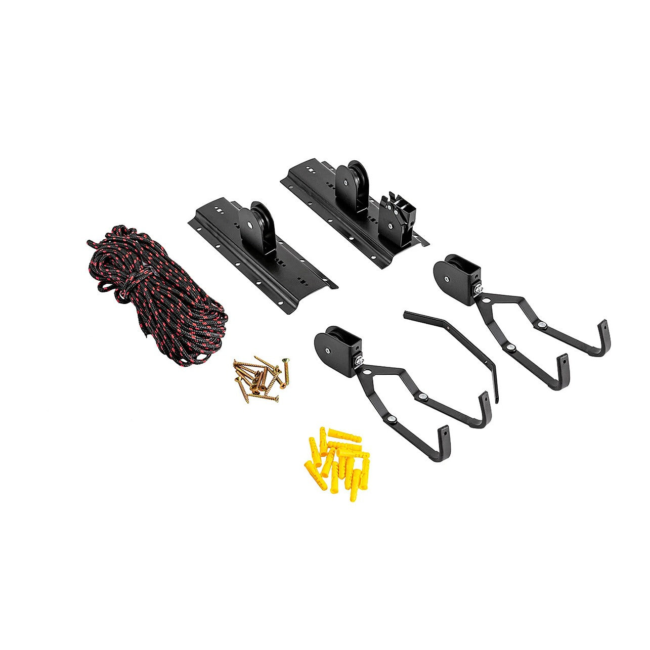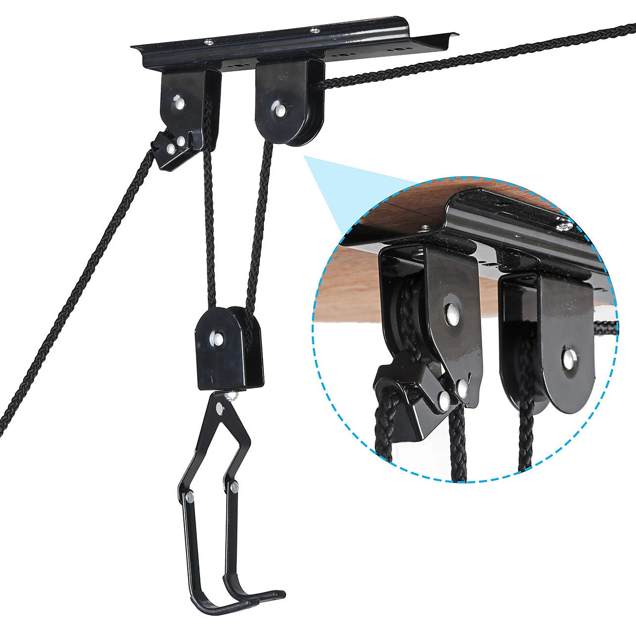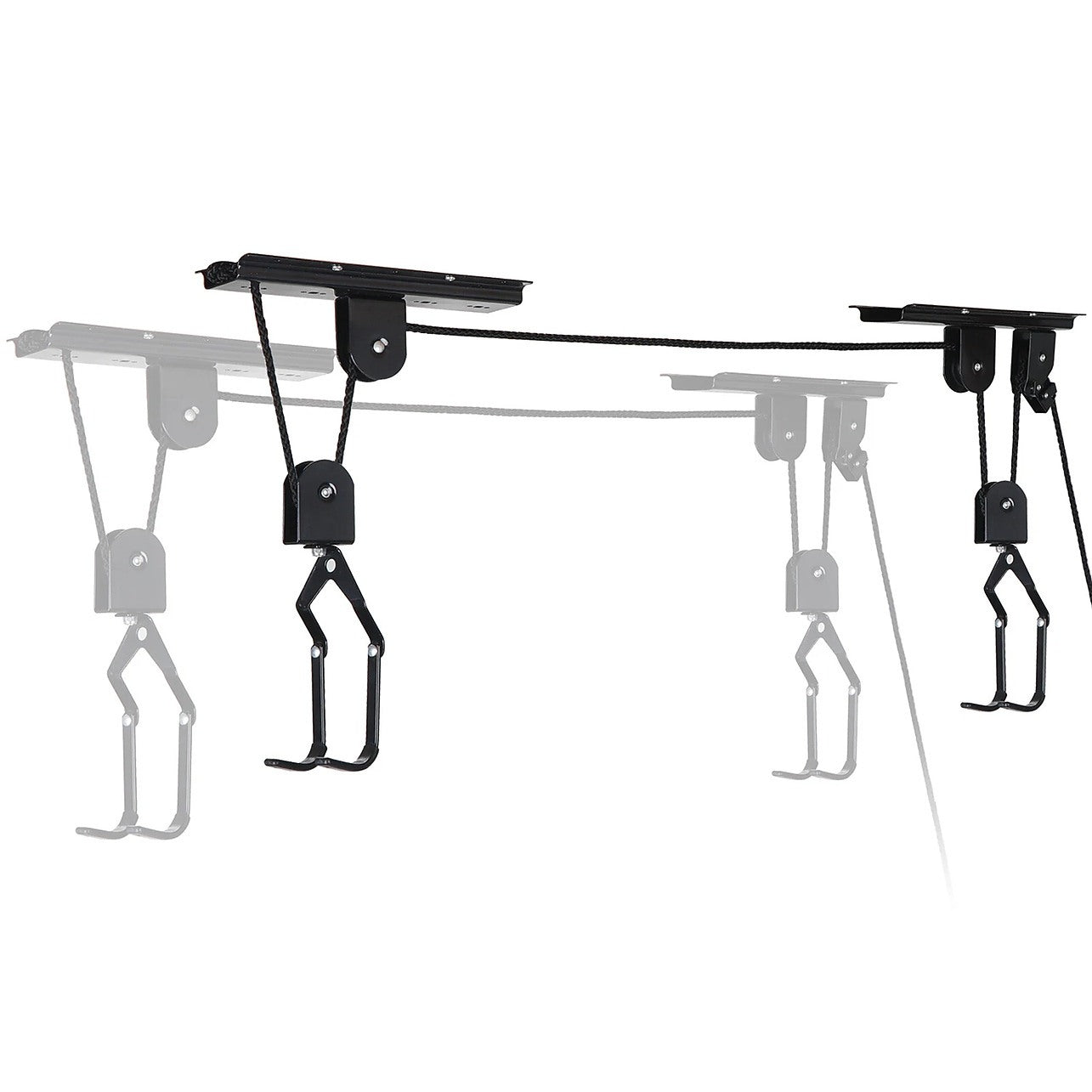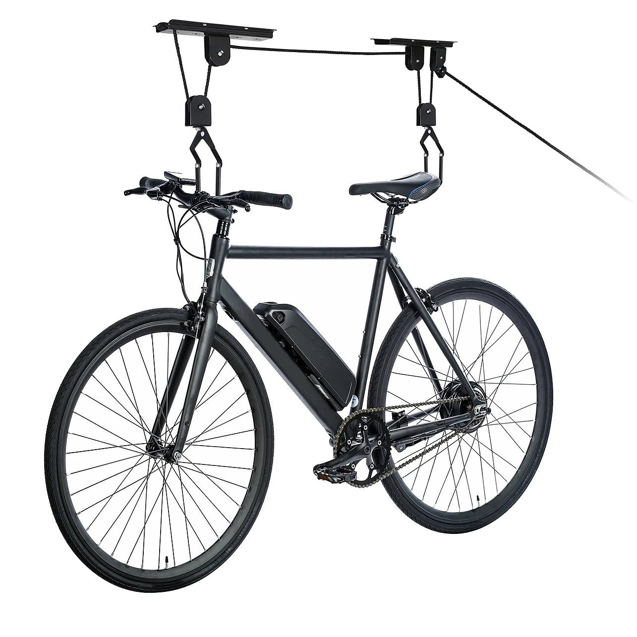 Maximise your garage or shed space with this Heavy Duty Bike Hoist Pulley Lift, designed to safely raise bicycles overhead and keep your floor clutter-free. Built from high-carbon steel with a sleek black finish, this ceiling-mounted system supports mountain bikes, road bikes, kids' bikes, folding bikes and more — and it also works perfectly for ladders, benches, and storage nets.