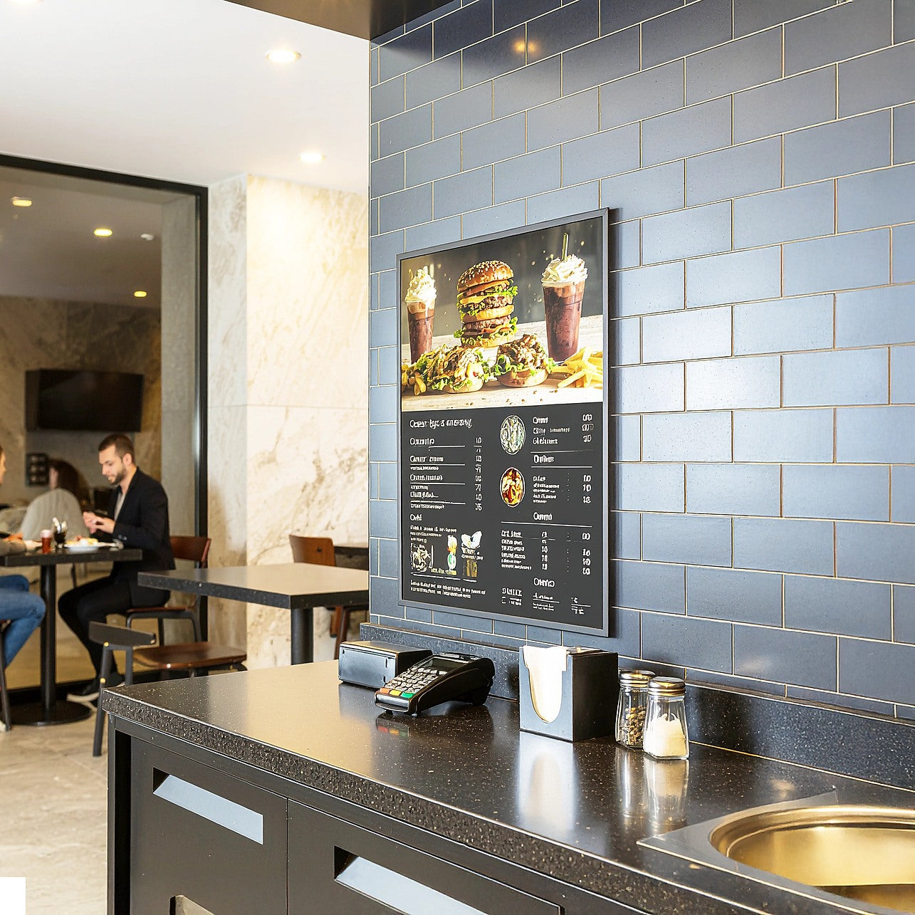 Illuminate your brand with the sleek and modern A1 LED Slim Advertising Lightbox Sign by Randy & Travis Machinery. Perfect for restaurants, bars, takeaways, and retail spaces, this ultra-thin lightbox brings a contemporary edge to any environment. Utilizing cutting-edge LED technology, it offers a luminous, cost-effective, and durable alternative to traditional lighting, ensuring your advertisements and menus truly stand out.