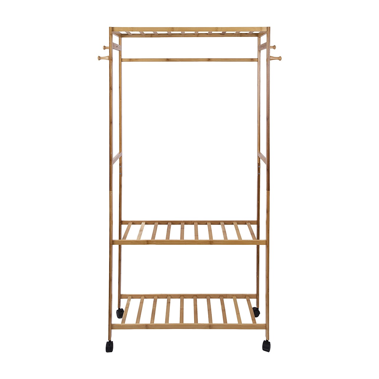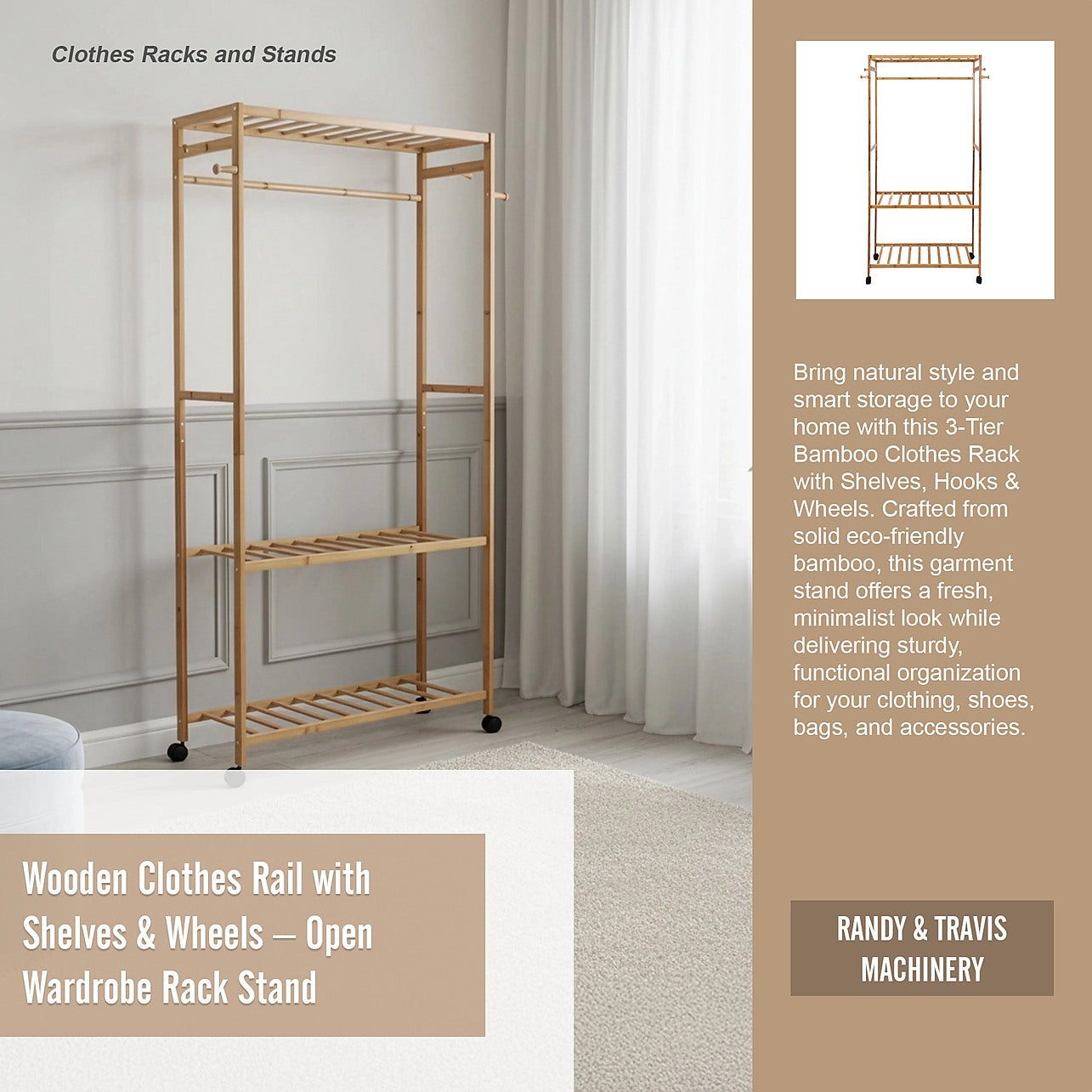 Bring natural style and smart storage to your home with this 3-Tier Bamboo Clothes Rack with Shelves, Hooks & Wheels. Crafted from solid eco-friendly bamboo, this garment stand offers a fresh, minimalist look while delivering sturdy, functional organization for your clothing, shoes, bags, and accessories. Featuring a hanging rod, side hooks, and 3 spacious shelves, it's perfect for creating a clean, tidy space in bedrooms, entryways, laundry rooms, or retail environments.