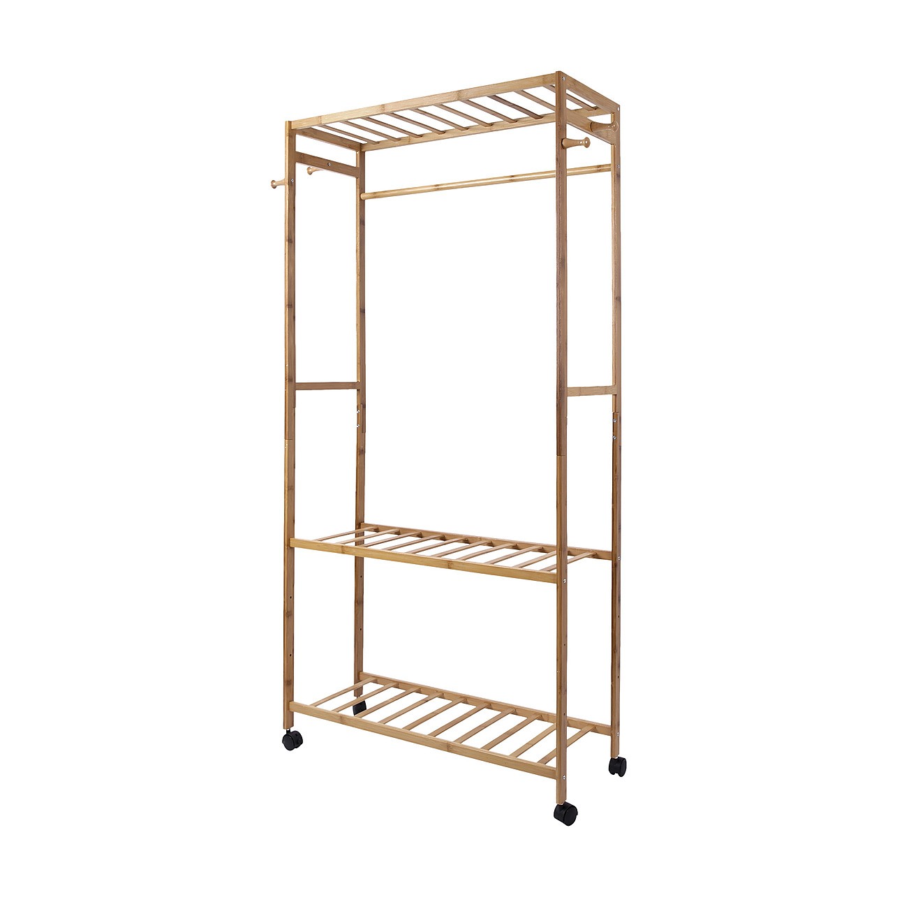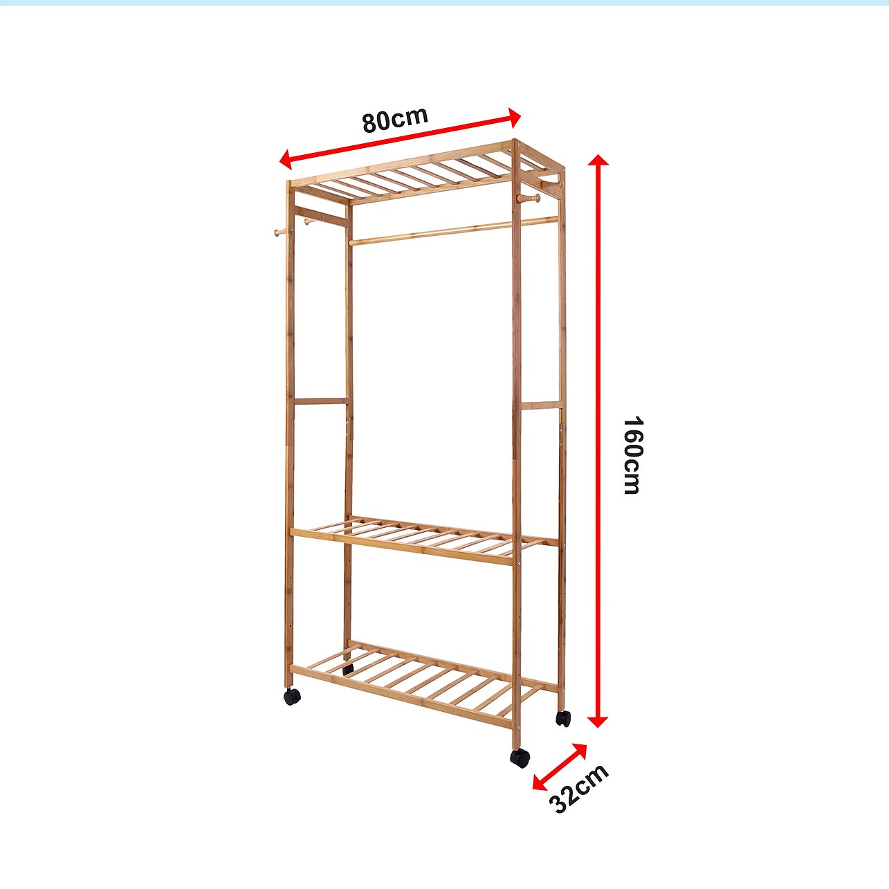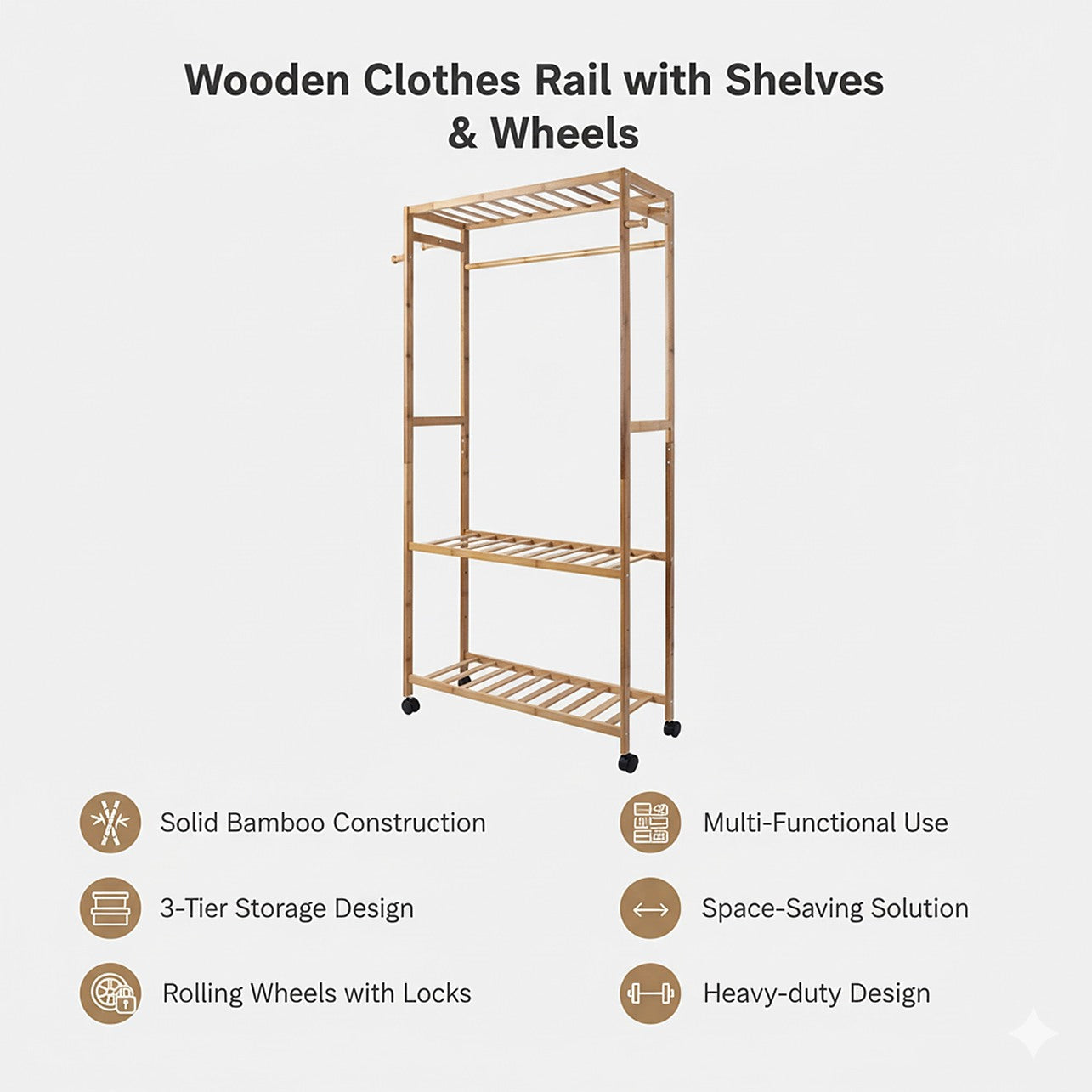 Heavy Duty Wooden Clothes Rail with Shelves & Wheels – Open Wardrobe Rack Stand