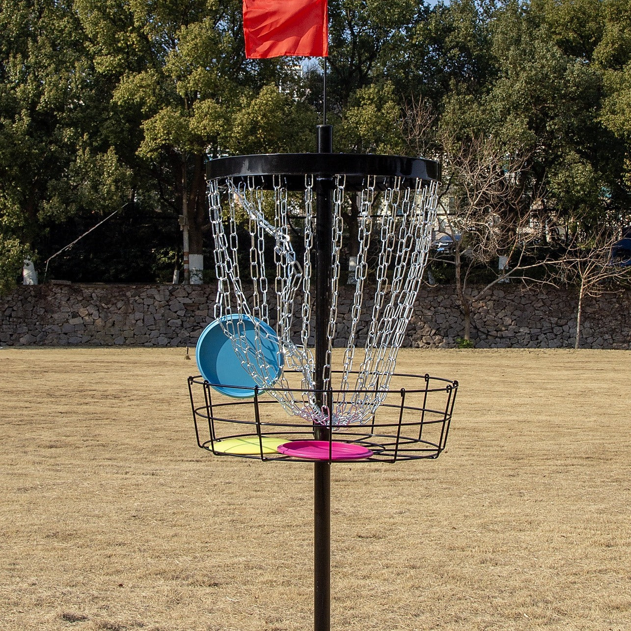 Built with 24 zinc-coated chains—this target minimises cut-throughs and pole bounces, helping discs drop cleanly into the basket. A reinforced welded frame, wide base, and three ground stakes provide excellent stability, even during strong throws or windy conditions.