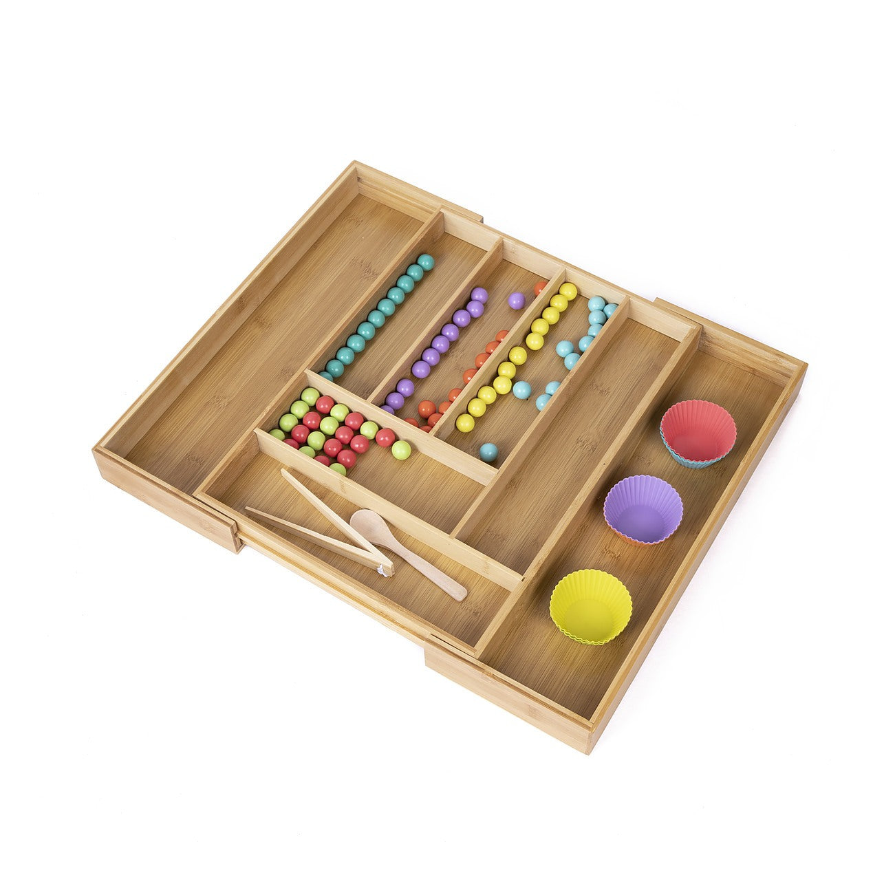 Built from durable wood material, it offers safe and long-lasting use in any kitchen setting. Whether fully folded or fully expanded, the tray is crafted to fit snugly into most standard kitchen drawers. Its easy-grip edge design allows for quick repositioning, and it cleans effortlessly with a rinse under water.