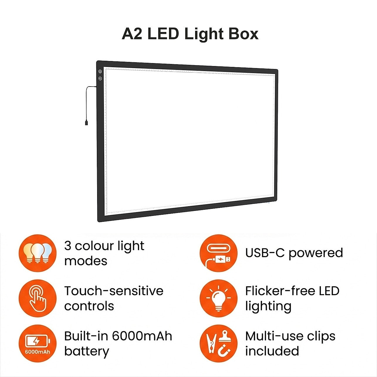 Upgrade your creative workflow with this versatile A2 LED Light Box, designed for artists, crafters, designers, and hobbyists. Featuring three colour temperatures—warm, natural, and white light—this tracing light board adapts to any environment, helping reduce eye strain during long creative sessions.