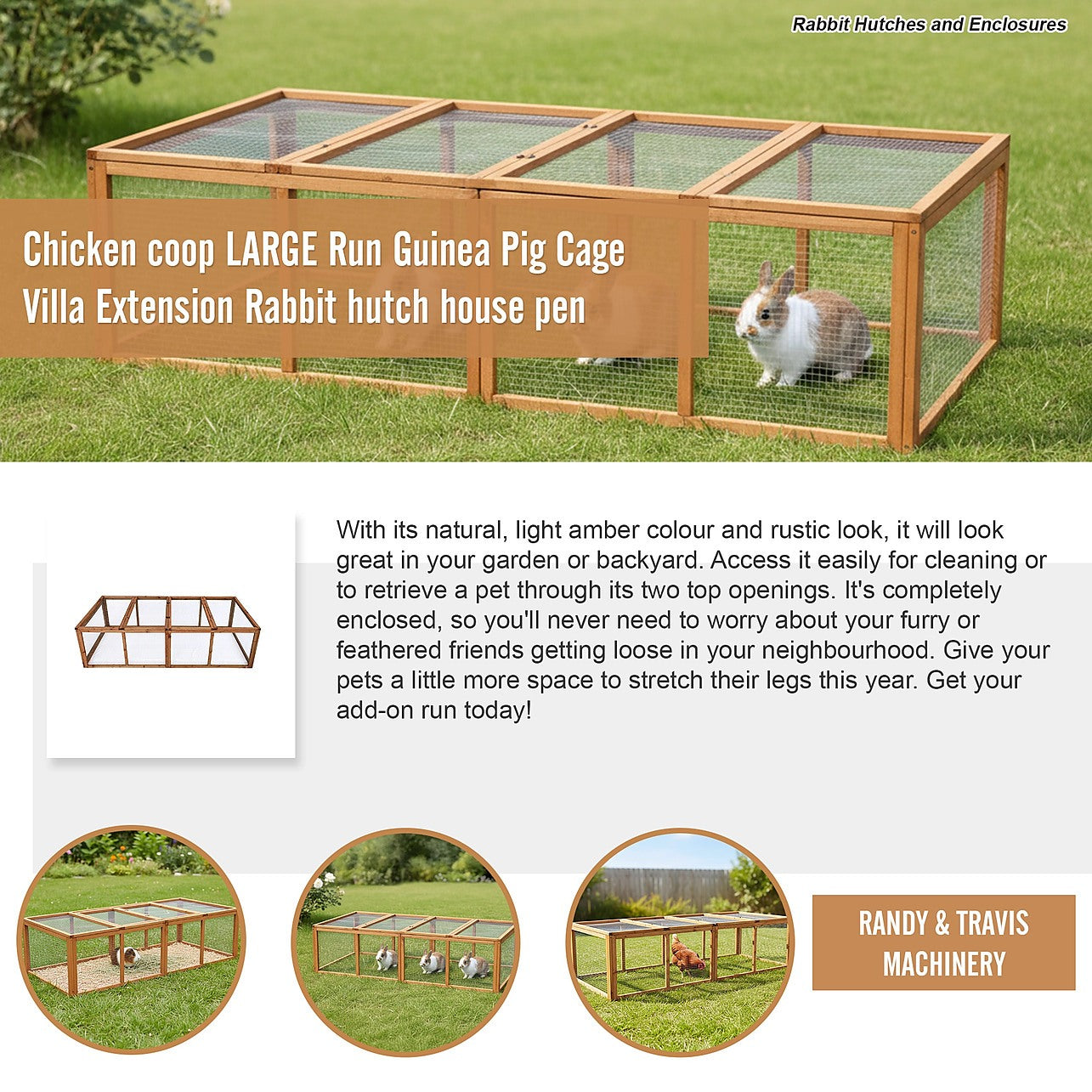 Do your chickens, rabbits, or guinea pigs need a bit more room to roam? If so, this pet hutch villa extension by Randy & Travis Machinery will give them that space and more. Mouse-proof and snake-proof, this extra run will protect your precious pets from predators and other pests while allowing them to stretch their little legs. Crafted from fine, rot-resistant fir timber, this large pet run can attach to your existing pet shelter to provide extra space. Or, you can use it as a separate area to put your pets in for a change of pace while you clean or do other maintenance on their regular quarters.