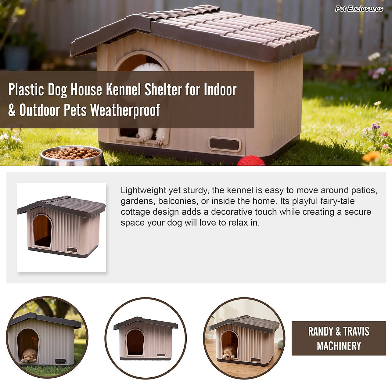 Lightweight yet sturdy, the kennel is easy to move around patios, gardens, balconies, or inside the home. Its playful fairy-tale cottage design adds a decorative touch while creating a secure space your dog will love to relax in.